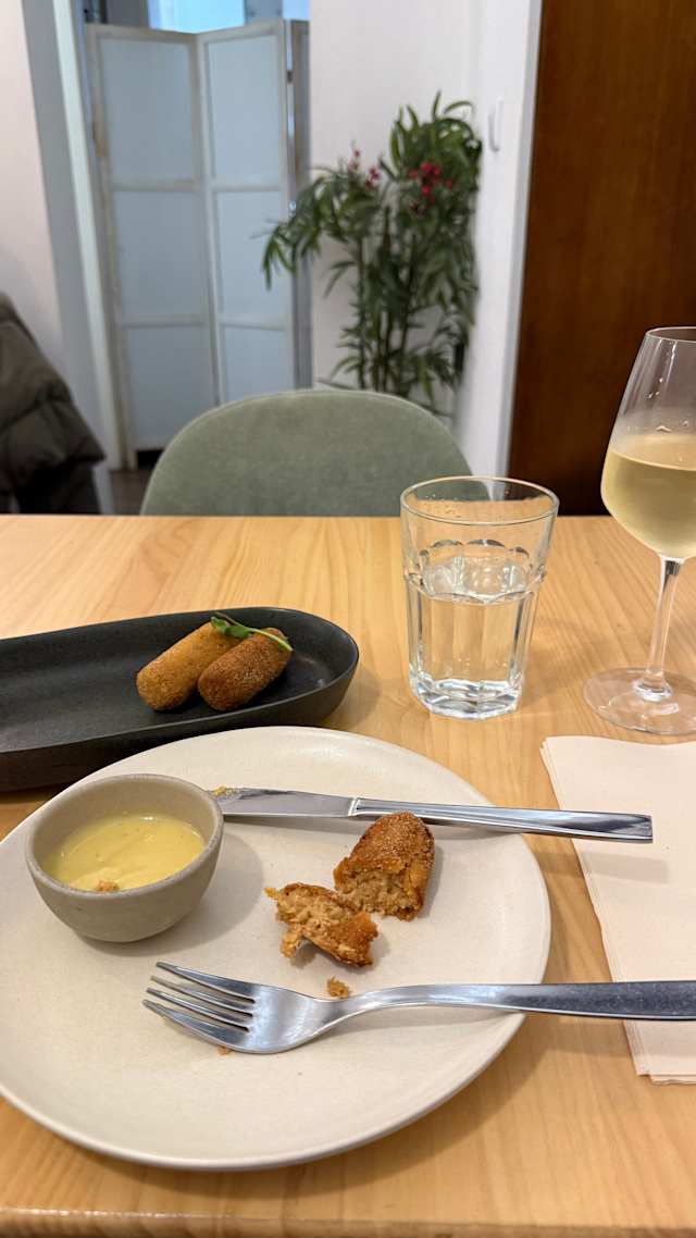 - Croquetes feitos de soja, tofu e uma pitada de picante acompanhados de maionese com mostarda e "mel"