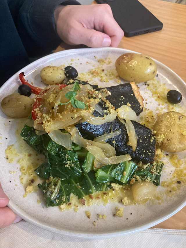 - Tofu envolto em alga, couve portuguesa, batata a murro, cebolada com pimento, finalizado com broa crocante. Opção sem glúten disponível.