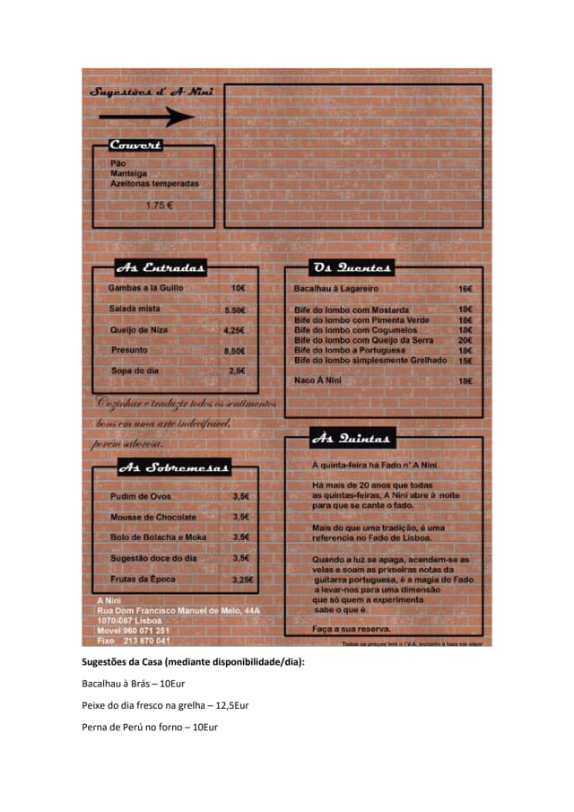9/10Really Lovely place! Friendly atmosphere.. you can listen authentic phado and Enjoi the real Portughese Food!