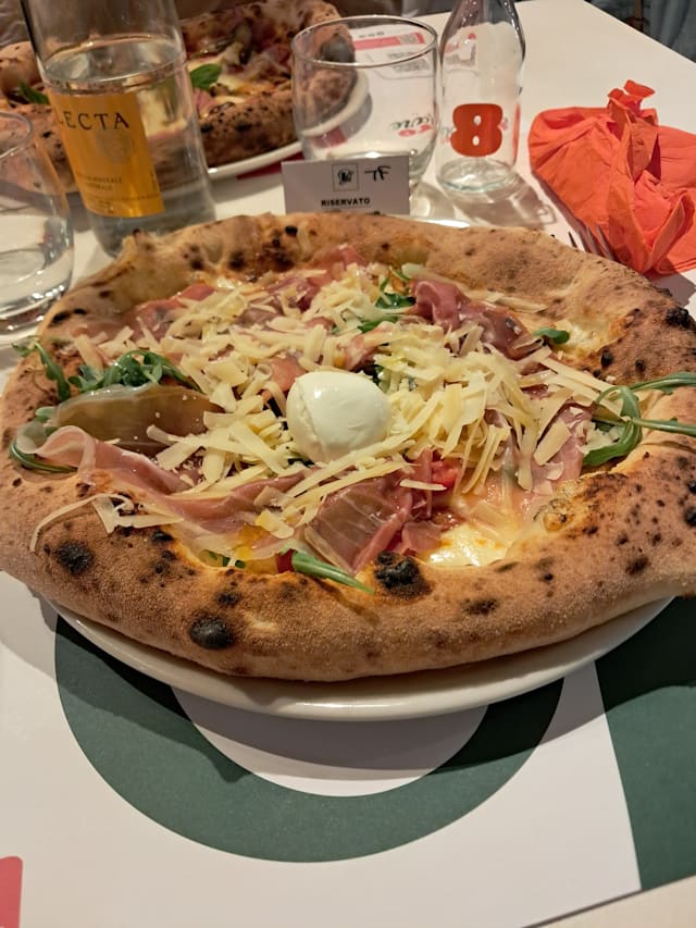 Fior di latte del casertano, pomodorini rossi, all'uscita rucola e prosciutto crudo, scaglie di parmigiano e olio evo