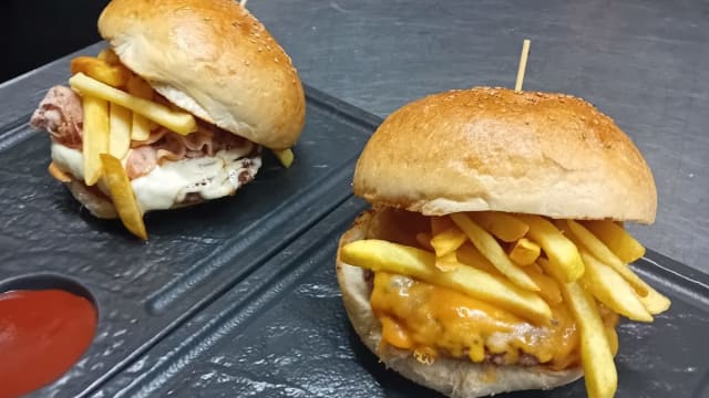 Hamburger di scottona (200gr.) patate dippers, mozzarella di bufala, mortadella, crema e granella di pistacchio