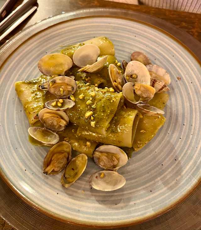 - Doppio filetto di branzino con gamberone, olive taggiasche e capperi di salina