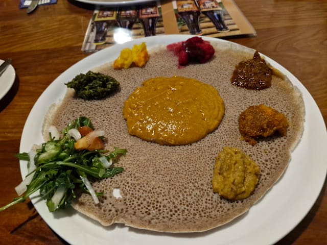 Lamsvless met groene kool, gekruide boter, knfolook, gember, ui en groene paprika. Geserveerd met injera, salade en linzensaus.