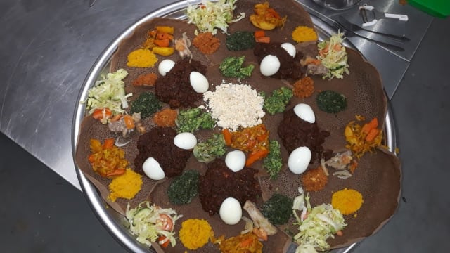 Eritrese tartaar, gekruid met geklaarde – en gekruide botersaus, heet gekruide chilipoeder en mitmita. Rood, medium of doorbakken. Gestoofde tartaar met boter en kruiden. Geserveerd mer injera, ayeb en alicha.