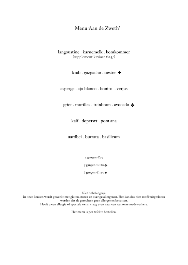 Aan de zweth prestige menu - 4 gangen€175 per guest