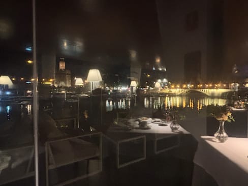 5.5/10+1The restaurant and its setting along the river were beautiful, but for top dollar prices, the food and service were disappointing. One waiter was excellent and friendly, but the second server was rather rude, and brought my husband a drink in a dirty glass, and then did not replace the drink when she brought a new, empty glass. She also did not check in once after the food was delivered to see if we needed anything (which we did... a new drink!) The food should have been excellent but was mediocre instead. My husband's steak was just okay and small for the price. My rice and scallops had only one large scallop, sliced thinly, at the bottom of the bowl. For that price and that level of dining experience, I expected 5-6 large scallops. The rice was fine, but nothing exceptional. This was supposed to be a celebratory dinner, but it was more hype than value. We weren't even seated next to the window, so there wasn't much of a view. I really wanted to love this place, but I won't return.