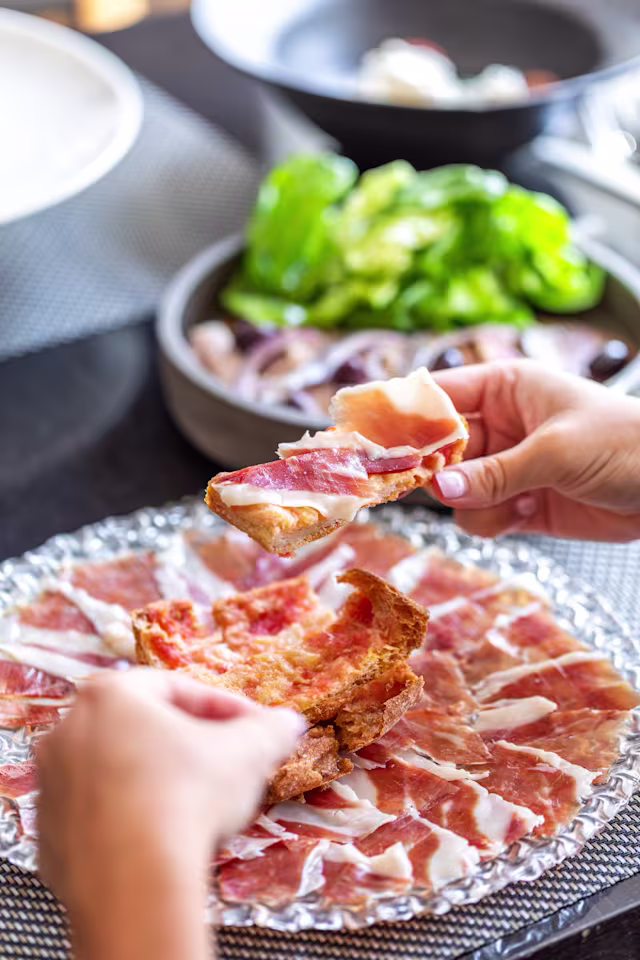 - Jamón ibérico de cebo 50% acompañado con pan de payés con tomate