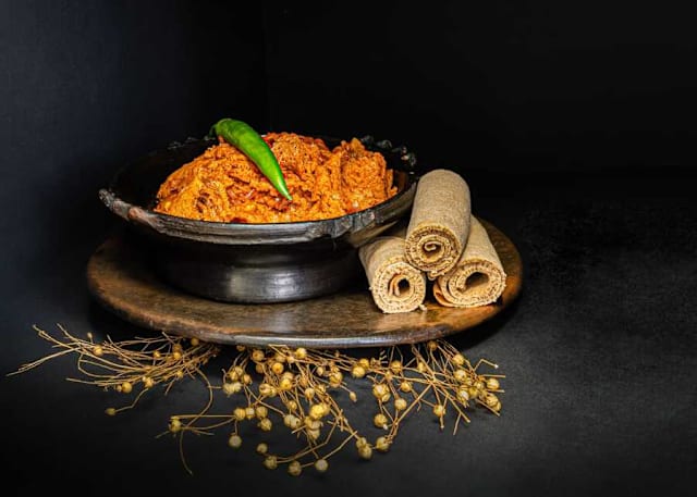 Gedroogde injera gemengd met saus op basis van rode ui, berbere, tomaat, look en rundvlees, klaargemaakt in olie of ethiopische boter.