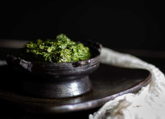 Spinazie met reepjes rundvlees gestoofd met ui, look en korerima.