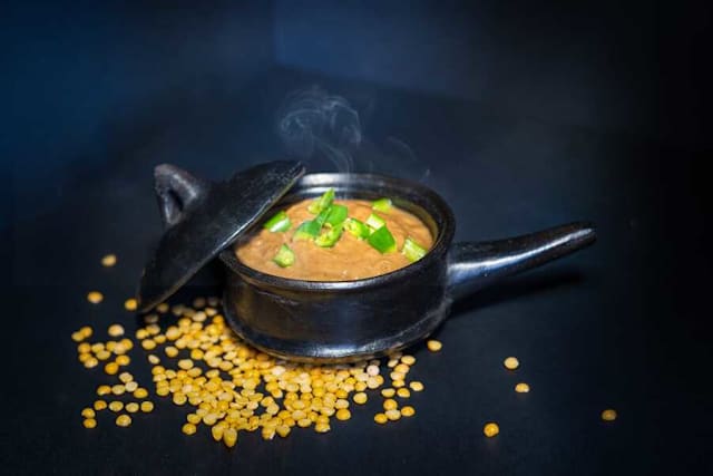 Gekookte linzen met gestoofde uien, kurkuma, look, gember en korerima.