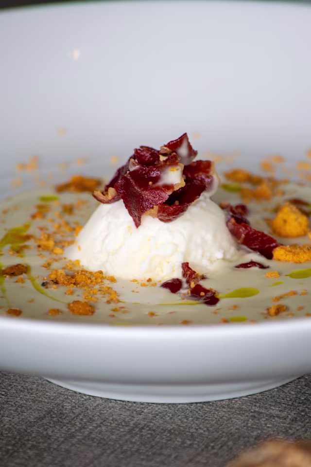 - Mézclum, queso de cabra, bacon y cebolla crujiente, fresas y vinagreta de frutos rojos