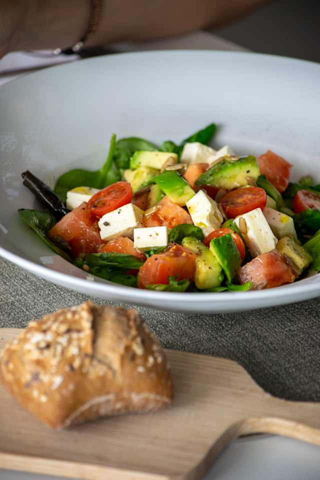 - Mézclum, queso feta, aguacate, tomate cherry, cebolla encurtida y pipas de girasol