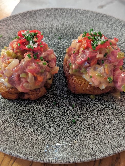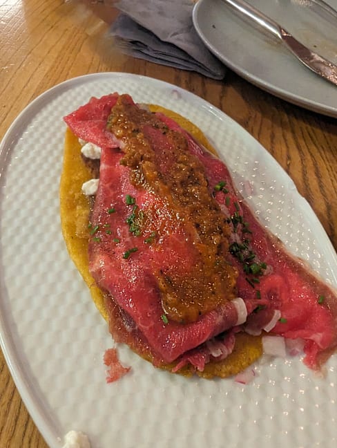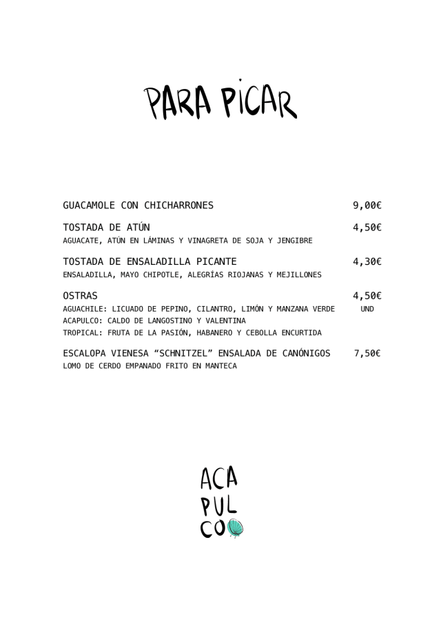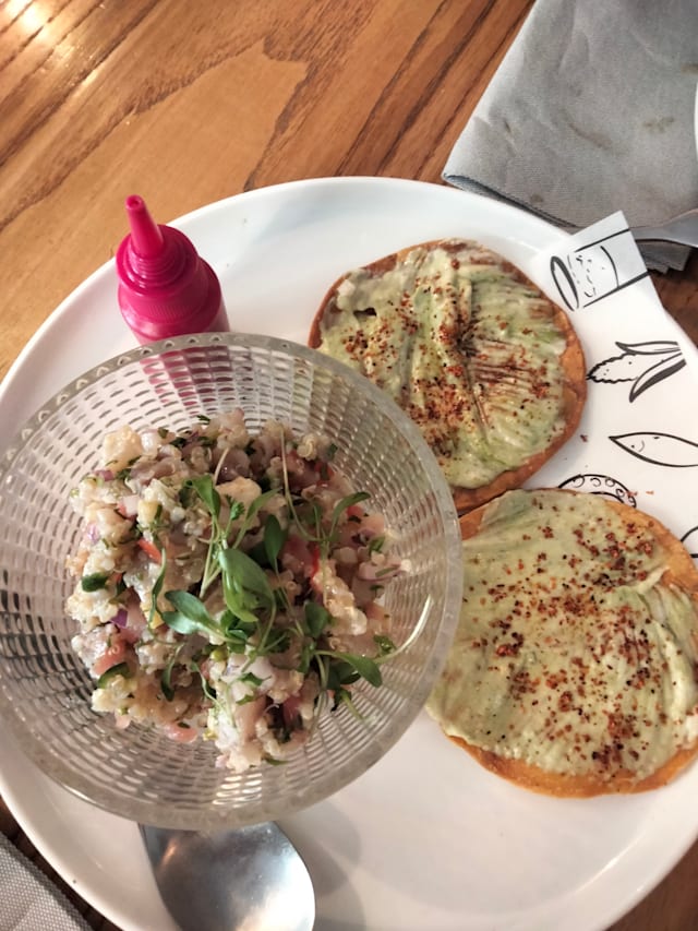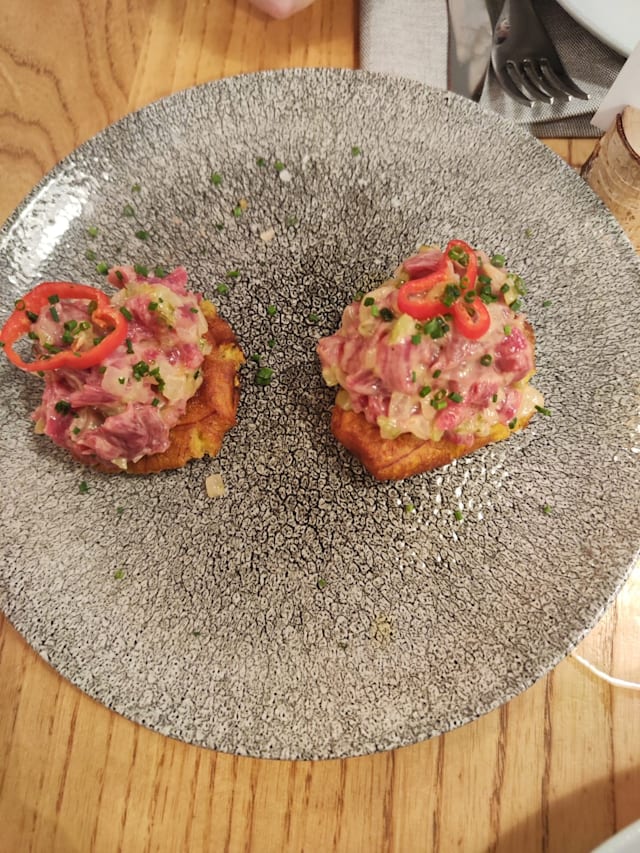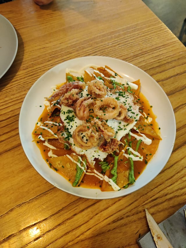 7/10Nice location- opens at 13:00. I ordered two plates which delivered quickly enough- a guacamole (at its base) and another plate that reminded me very much of nachos - indeed the chips were prominent and did not appear or taste homemade. Both dishes seemed exceedingly salty - the guacamole was ok... This restaurant has a 9.1 rating - that seems a bit high for what I experienced. Wine was good, but had been in a very cold fridge and was way too cold (better than hot I suppose).