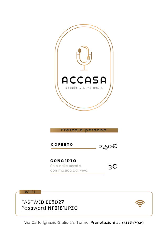 Per le serate del venerdì e sabato nelle quali è prevista musica dal vivo, è previsto un contributo concerto di € 3 a persona. Tesseramento necessario in loco. Per aggiornamenti sugli eventi in programma visitare la pagina Instagram @accasatorino