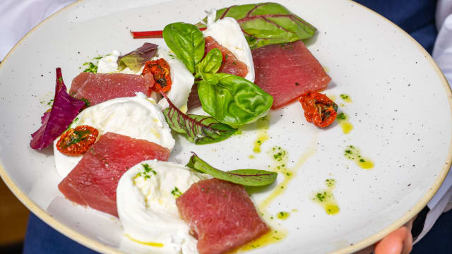 Mozzarella di bufala con crudo di tonno, pomodoro confit e salsa al basilico