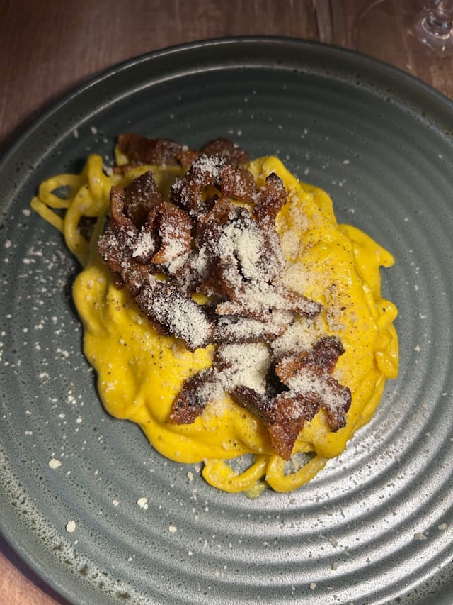 Mezze maniche acqua e farina al sugo amatriciana, fatto con pomodori italiani e guanciale stagionato al pepe, mantecato con pecorino romano DOP