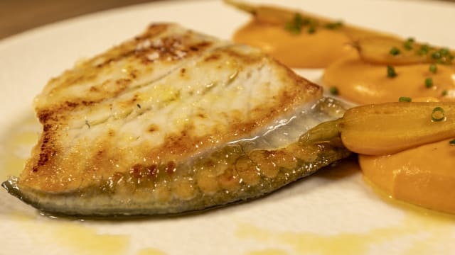Lomo de corvina a la plancha, cous-cous y crema de calabaza
