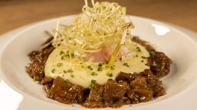 Steak tartar con helado de mostaza antigua, yema de huevo de cordorniz y pan diamante