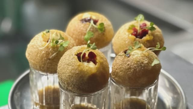 Bola frita rellena de patata, garbanzos, y arándanos, servida con agua de tamarindo y salsa de yogur y menta