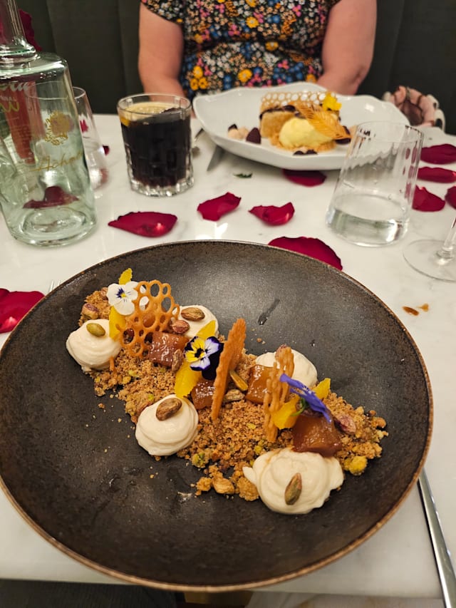 Crumble de pistácio com cremoso de baunilha, ananás caramelizado e cítricos