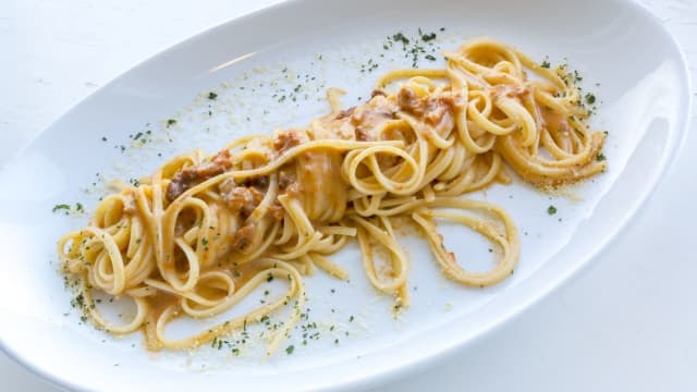 Chitarrina di grano duro con alici fresche, scorsette di limone, bisque di gamberi e pesce, polvere di tarallo salentino e bottarga di muggine