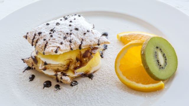 Sfogliatina caramellata con crema chantilly e pezzi di frutta fresca di stagione
