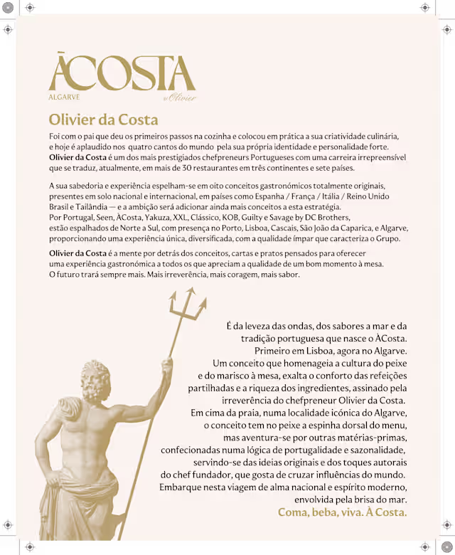 The vibe of the restaurant overall is very nice and aesthetic, with Vilamoura's most famous beach right by your side. The fish (we asked for 2 whole pregados) was half half. One fish was extremely dry and clearly left on the grill for far too long, while the other one was perfect. The Acosta Egg entree was also very good. But the service was disappointing considering the price you pay. Exaggerated waiting times whilst we were 1 of 2 tables in the restaurant, lack of inventory, as they last second told us there was only one petit gateux left, 20+ mins waiting for dessert and coffee (in an empty restaurant). Clearly understaffed, not necessarily in terms of quantity but quality. Everyone from the staff was nice, no rudeness, but we felt like a restaurant with this Olivier prestige behind it, should have staff to match their prestige.