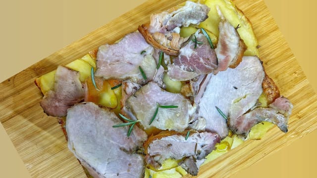 Fiordilatte affumicato, patate al forno, pomodorini confit, porchetta di ariccia e maionese al rosmarino