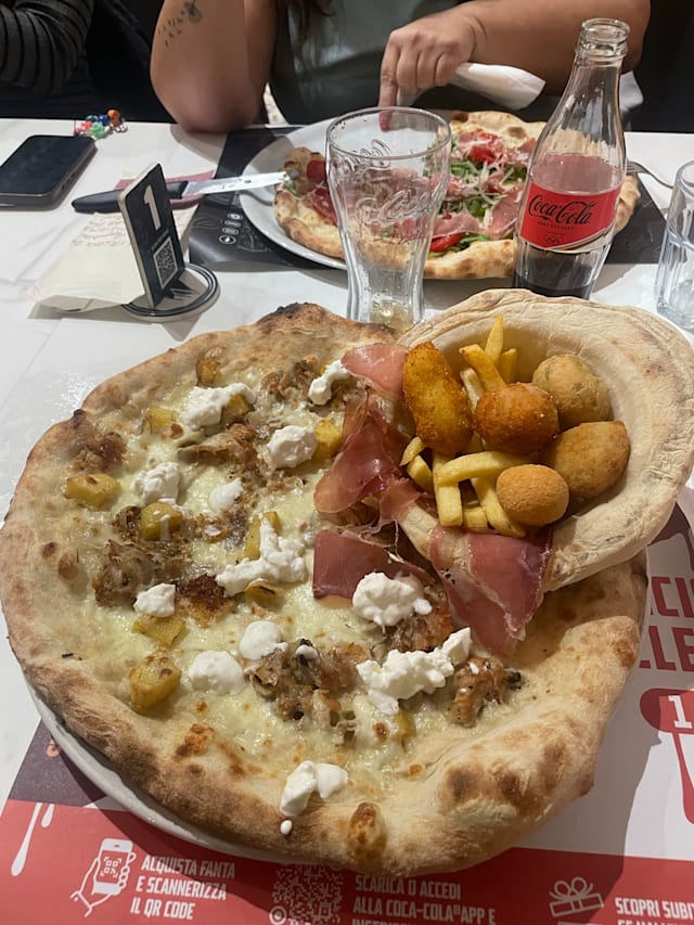 Pizza a scelta del cliente, sopra adagiato un cestino di pizza ripieno di fritto napoletano con aggiunta di prosciutto crudo e ciliegine di mucca.