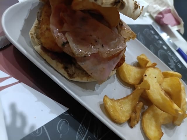 Hamburger di Scottona,crocche, prosciutto cotto, provola e salse a piacere