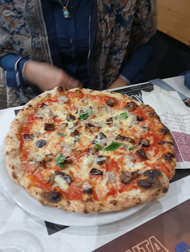 Pomodoro san Marzano, fior di latte , melanzane ,olio evo, scaglie di parmigiano reggiano,basilico, salsiccia