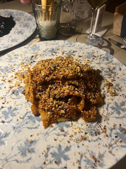 9/10The interior is very attractive and reflects the nature of the city’s history. Our servers were very friendly and attentive. After we ordered our meal warm bread with EVOO was brought and it was yummy. We really enjoyed both our starters - the Polpette di Melanazane and chickpeas fritters with bacala were light and flavorful, perfectly seasoned. We also enjoyed the very abundant casarecce Brontese pistachio cream and fuori Norma (with swordfish) pastas. The wine list has many good choices. Sadly we had no room to try a dessert.