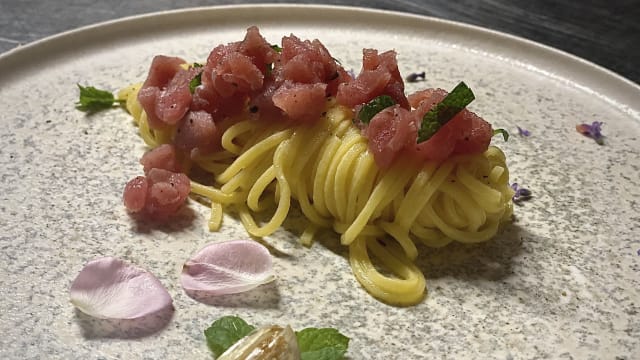 Spaghettoni rummo, pecorino, pepe, battuta al coltello di gambero rosso