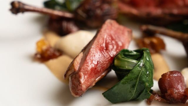 Carré di maialino iberico, porcini, susine, mayo di acciughe