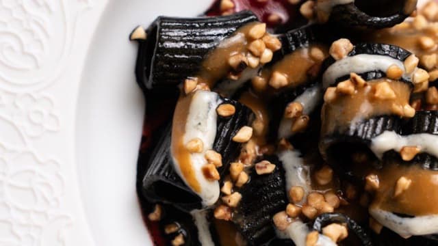Mezzemaniche all’albume pastificio massi, aglio nero, liquirizia, ricci di mare.