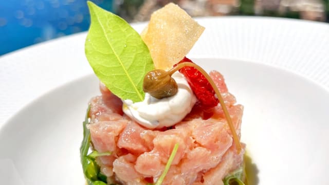 Cannolo croccante ripieno di tartare di tonno al lime, granella di pistacchio e crema di melanzane all’aglio nero