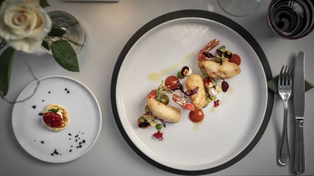 Tempura di gamberi su un letto di avocado, spuma di ricotta e salsa agrodolce
