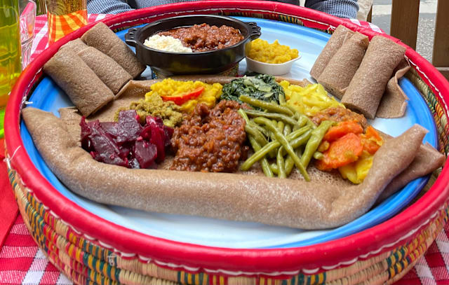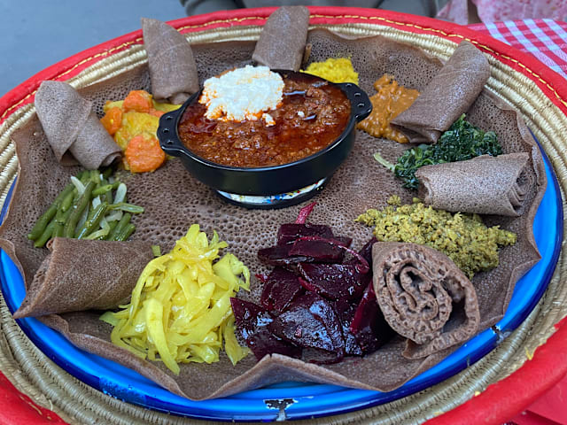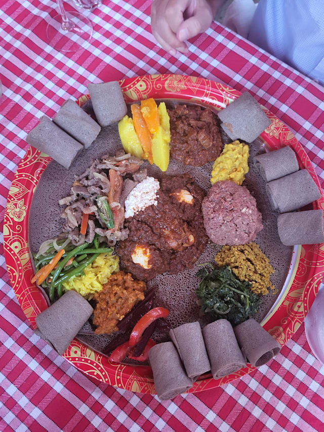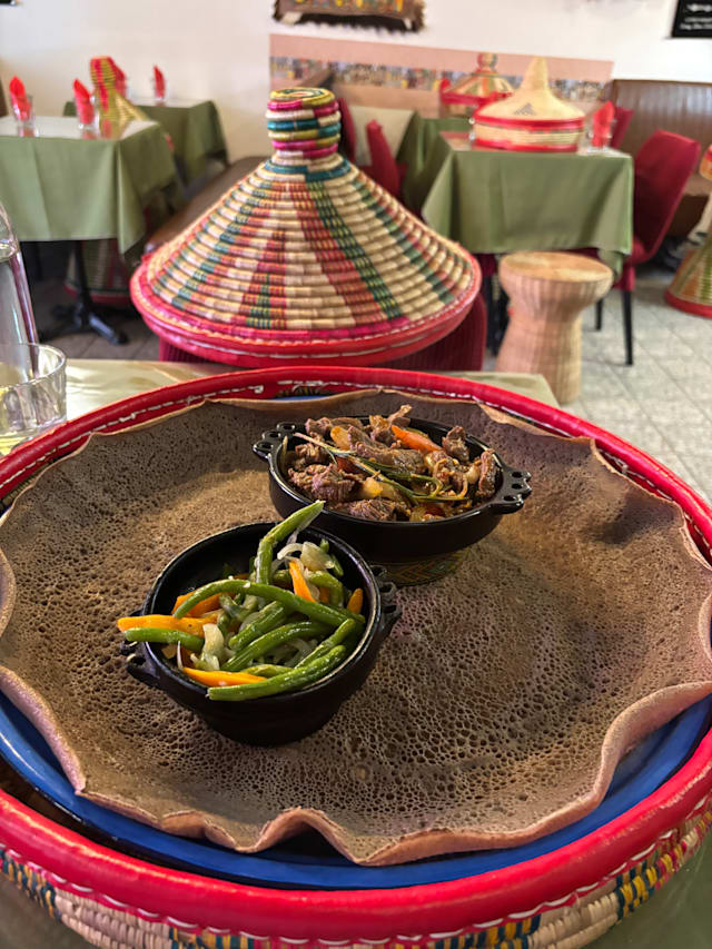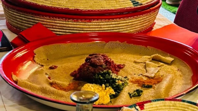 10/10It was a first experience with Ethiopian food for our friends. The staff made us feel welcome and explained the cuisine and how it is served on the injera. We had a beautiful platter with vegetarian items for all four. Delicious and enjoyed in a friendly atmosphere.