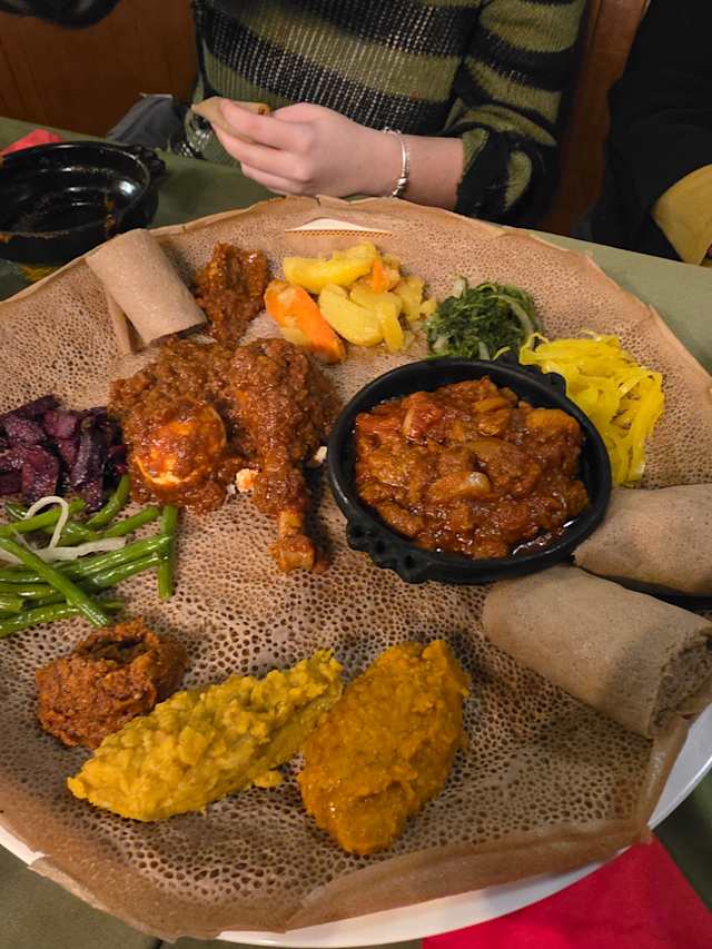 - Ragout de mouton en sauce, assaisonné d’épices éthiopiennes, accompagné d’injera.