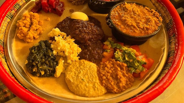 - Tartare de boeuf mélangé au mitmita (piment rouge éthiopien) et du kibbé (beurre clarifié), accompagné d'aib (fromage éthiopien).