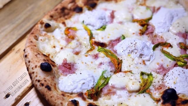 (cipolla ramata di montoro stracotta. Lardo, fior di latte, basilico e all'uscita scaglie di cacioricotta di capra cilentana "presidio slow food)
