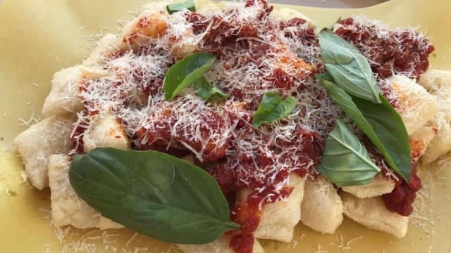 (pomodoro, pancetta a cubetti pepata, basilico e parmigiano