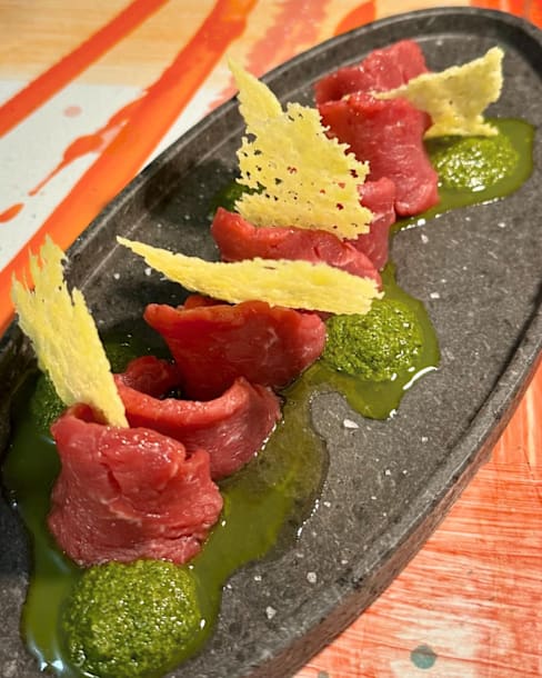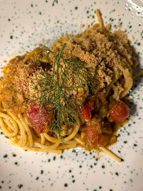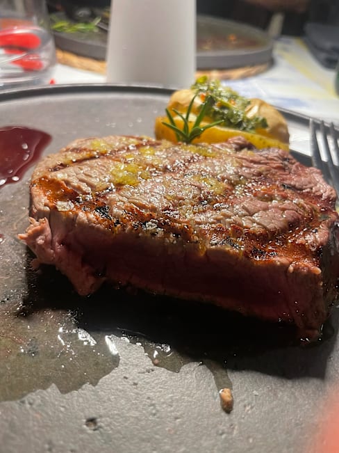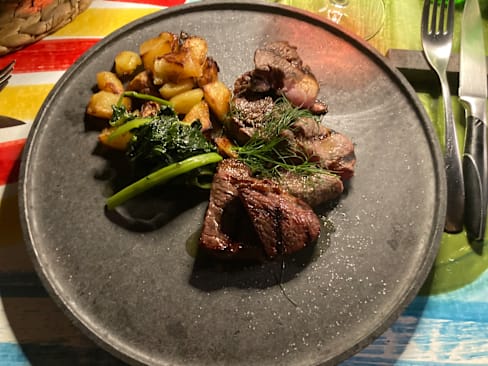 8/10My spaghetini con sarde was excellent, full of flavour (one of my favourite Sicilian dishes). I was a bit disappointed by the fact that two of the beefs on special were only available as a 1kg steak at a whopping 95 euros. We got the rib eye priced at 38 euros which was cooked and seasoned well but I found the brandy sauce far too sweet, would have preferred a chimmichurri which I saw with other menu items. I asked for mustard and it was from a packet not a high quality dijon. Aside from the sauce situation was a great meal + great attentive service and nice wine and would recommend.