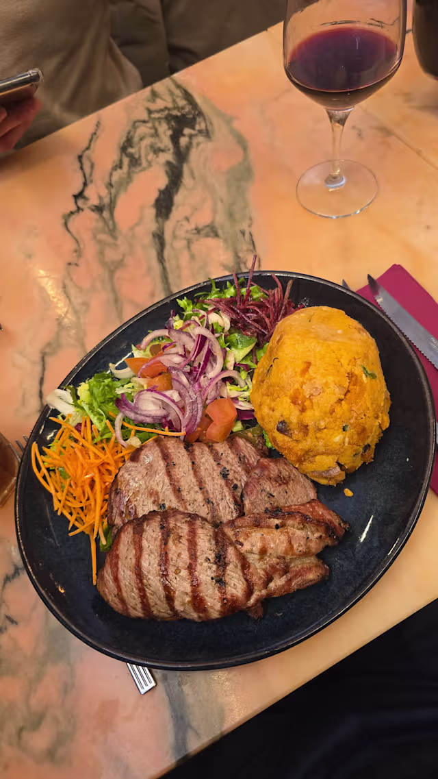 8.5/10The restaurant's location was a wonderful surprise—Carnide feels like a charming oasis in the middle of the city. The service was warm and attentive. At times, the noise levels were slightly uncomfortable due to the room’s acoustics. The starters were excellent! We had conquilhas à Bulhão Pato and bolinhas de alheira, both full of flavor. For mains, we chose lagartos de porco preto and entrecosto com migas alentejanas. While the dishes were enjoyable, the seasoning was on the mild side, and the lagartos were slightly overcooked at the edges. To finish, we had torta de laranja, which was delicious. Overall, a good experience—just a slight adjustment in meat seasoning would make it even better!