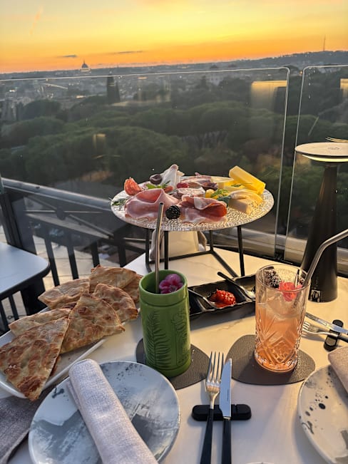 10/10Perfect rooftop to have cocktails and tapas at sunset. The staff was extremely friendly and helpful. They moved us to the best seat in the house when it back available. The live music was complimentary to the ambiance. Definitely a highlight of our trip to Rome.