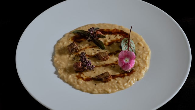 - Risotto "Acquerello" al Miso, salsa teriyaki e petto d'anatra scottato.