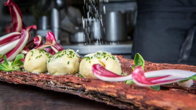 Ragù di salsiccia | radicchio | fonduta castelmagno | polline di finocchio