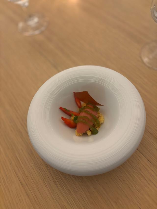 - Pêche de ligne du jour à la vapeur, asperges vertes et panisse, sucs de cuisson