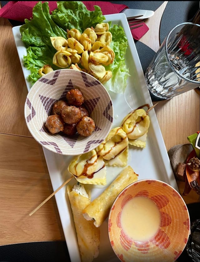 Piatto unico con tortellini fritti, spiedino di tortelloni di ricotta, polpette di carne, crema di parmigiano e cannoli ripieni di ricotta in crosta di parmigiano