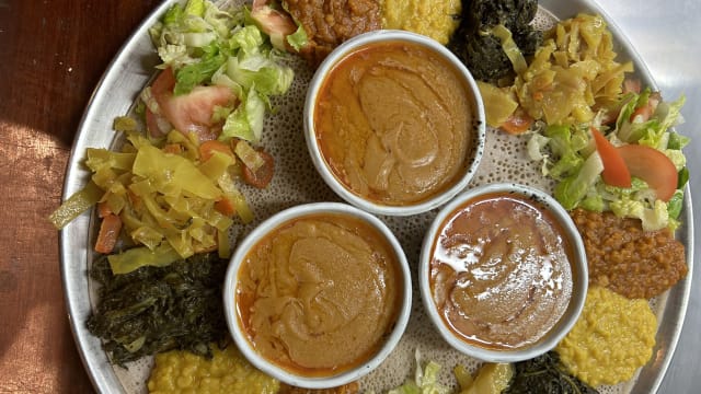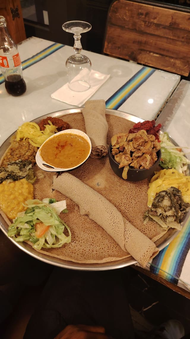 7/10When we wanted to order, the waiter said that the mixte plate, Beyainatu, was not enough for two people and that we need to add one more dish so it will be enough. But in fact, the mixte plate would have been plenty enough, we had a hard time to finish it all. Overall, the food was delicious, it was our first time trying Ethiopian food. Careful, when you see the bill, even though there is a discount, they do not do it on the Beyainatu. I don’t know why, it is not a menu, but just a plate and they don’t warn you beforehand.